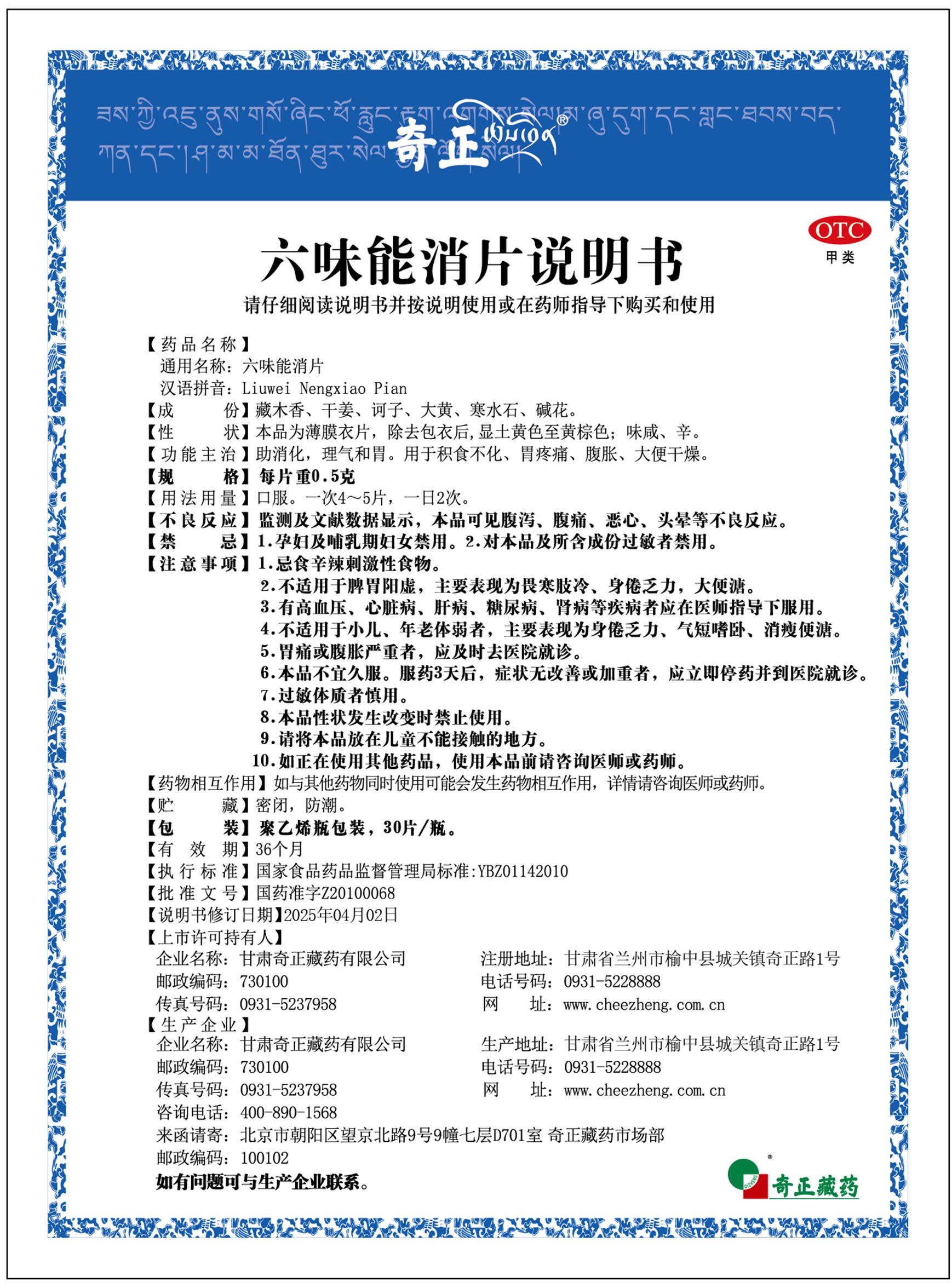 甘肅奇正藏藥有限公司按照六味能消片獲批的《國(guó)家藥品監(jiān)督管理局藥品補(bǔ)充申請(qǐng)批準(zhǔn)通知書》(編號(hào):2024B06184)內(nèi)容,對(duì)六味能消片藥品說(shuō)明書中的【不良反應(yīng)】、【禁忌】和【注意事項(xiàng)】進(jìn)行了修訂及備案,現(xiàn)將新版說(shuō)明書予以發(fā)布,如您需要更為詳細(xì)的信息或有特定的問(wèn)題,可以聯(lián)系客服400-890-1568或撥打企業(yè)電話:0931-5228888。